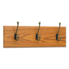 WOOD WALL RACK, THREE DOUBLE-HOOKS, 18W X 3.25D X 6.75H, MEDIUM OAK